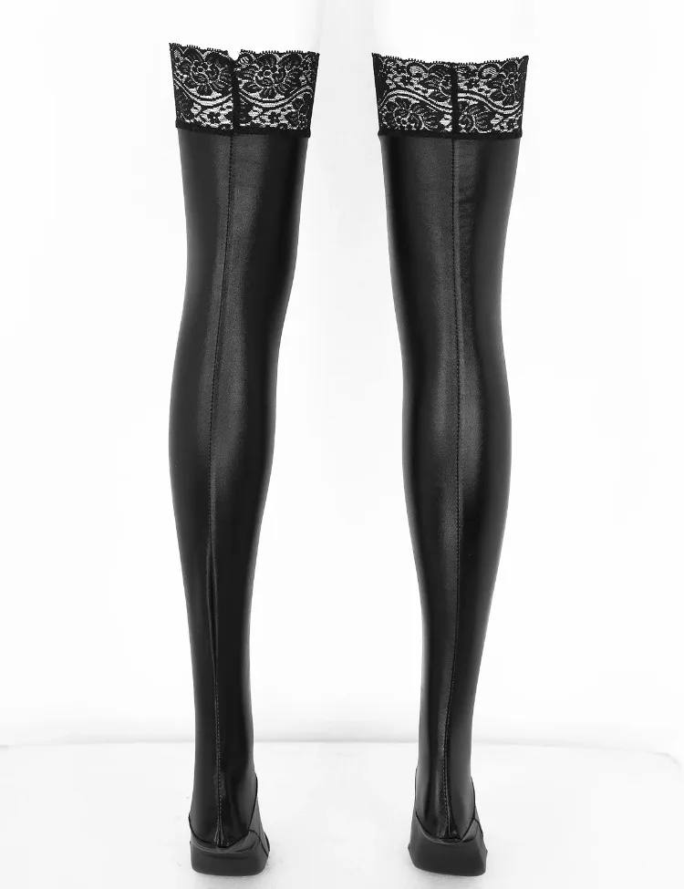Pu Leather Lace Stockings Sexy Black Clubwear Costumes Women Anti-skid Elasticity Wet Look Patent Thigh High Footed Cosplay
